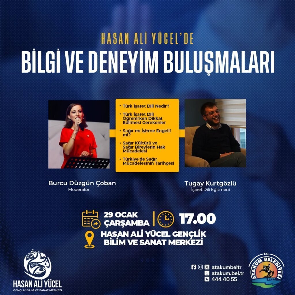 Atakum Belediyesinin Hasan Ali Yücel Gençlik Bilim ve Sanat Merkezinde düzenlediği bilgi ve deneyim buluşmalarında bu hafta, Türk İşaret Dili ele alınacak. Program, 29 Ocak Çarşamba günü saat 17.00’de başlayacak.