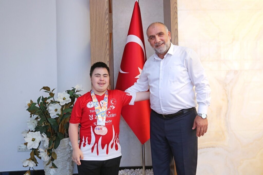 Down Sendromlular Dünya Şampiyonası’ndan zaferle dönen milli sporcu Salihcan Öztankal, Canik Belediye Başkanı İbrahim Sandıkçı’yı ziyaret etti.