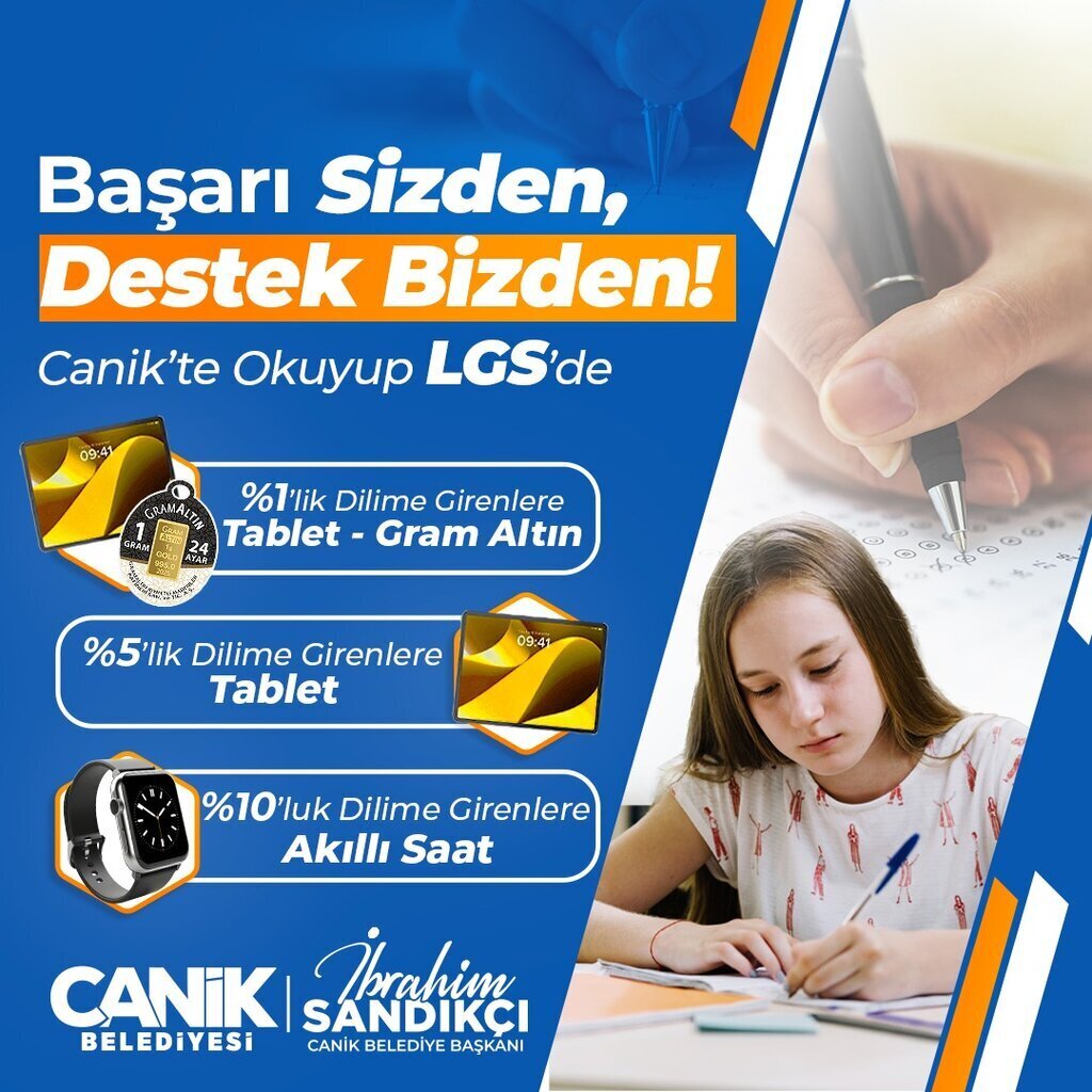 Canik Belediyesi, geleneksel YKS ve LGS ödülleri çerçevesinde 2025 YKS’de ilk 500’e giren öğrencilere laptop, ilk 5 bine giren öğrencilere cep telefonu, ilk 50 bine giren öğrencilere tablet hediye edecek. Hayata geçirdiği projelerle öğrencilerin yüzünü güldürmeyi sürdüren Canik Belediyesi, 2025 LGS’de yüzde 1’lik dilime giren öğrencilere tablet ve gram altın, yüzde 5’lik dilime giren öğrencilere tablet, yüzde 10’luk dilime giren öğrencilere akıllı saat hediye edecek.