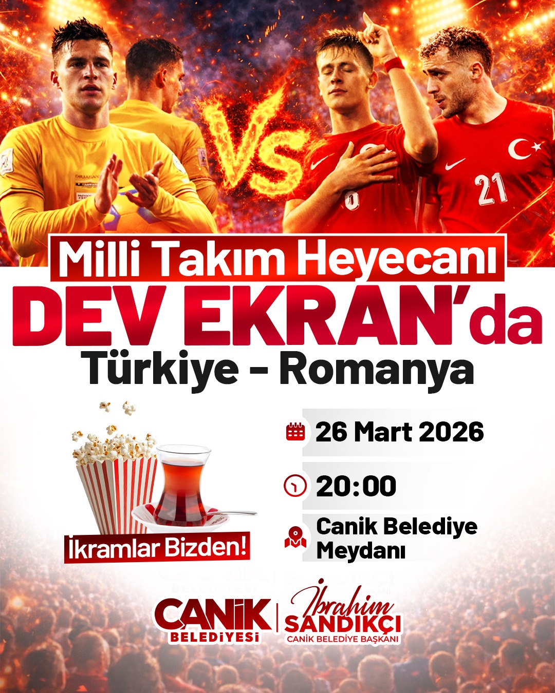 Canik Belediyesi, ilçede gerçekleştireceği etkinlikle Türkiye-Romanya karşılaşmasını dev ekranla vatandaşlarla buluşturacak. Milli maç coşkusunun yaşanacağı etkinlikte vatandaşlar, Türkiye A Milli Futbol Takımı'nın FIFA Dünya Kupası'na uzanan yolculuğunda Romanya ile mücadele edeceği karşılaşmayı dev ekranda takip edecek. Canik Belediyesi'nin vatandaşlara ikramlarda bulunacağı, çocuklar için karşılaşma öncesi aktivitelerin düzenleneceği etkinlik, 26 Mart 2026 Perşembe günü saat 20.00'da Canik Belediyesi hizmet binası önünde gerçekleştirilecek.