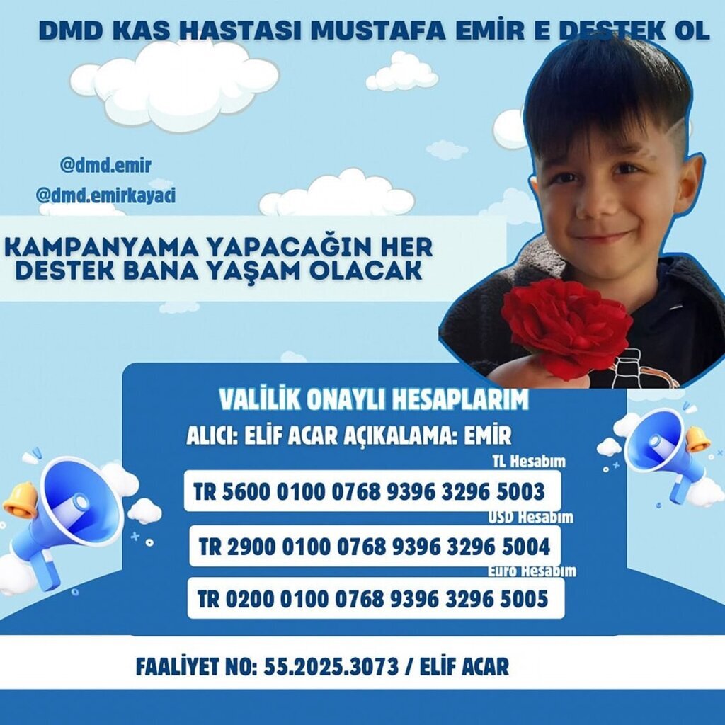 Genetik ve ilerleyici bir kas hastalığı olan DMD, kasların zamanla zayıflamasına ve günlük yaşam becerilerinin kaybedilmesine yol açıyor. Minik Emir’in sağlığına kavuşabilmesi için maddi desteğe ihtiyacı var“Kampanyama Yapacağın Her Destek Bana Yaşam Olacak”