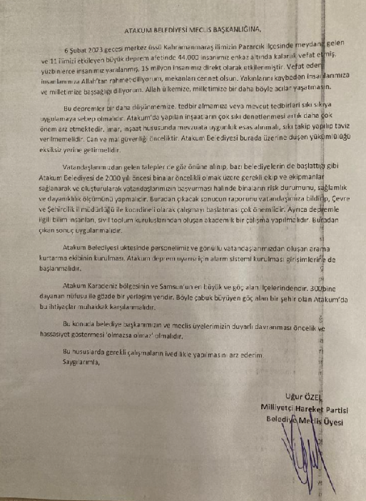 MHP’li Belediye Meclis Üyesi Uğur Özel’den Atakum Belediyesi’ne deprem teklifi!