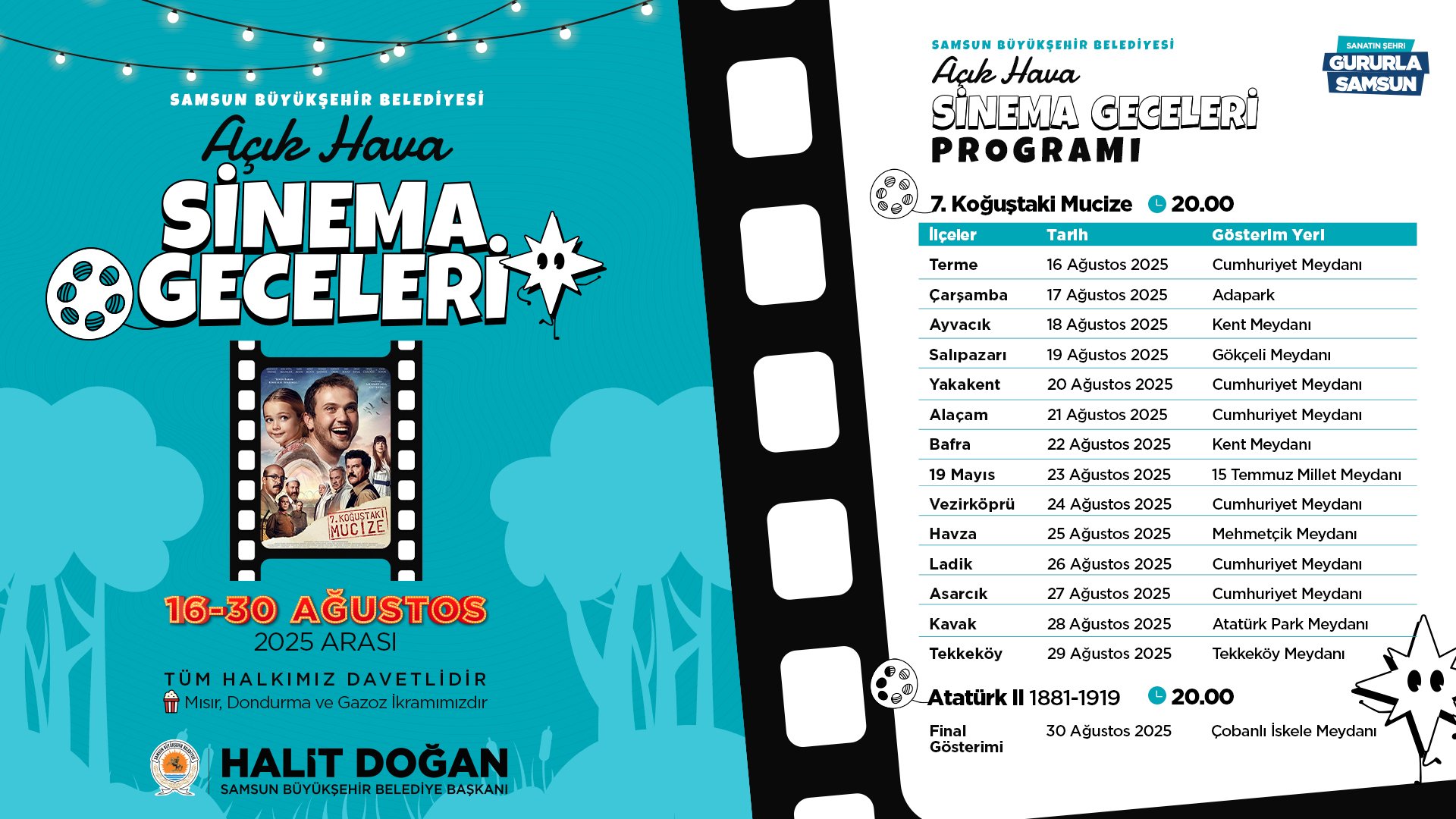 Gösterimi yapılacak olan film ise izleyicilerden tam not almış, duygusal ve etkileyici hikayesiyle dikkat çeken “7. Koğuştaki Mucize” olarak belirlendi. Gösterimler, 16 Ağustos saat 20.00’de Terme Cumhuriyet Meydanı’nda, 17 Ağustos saat 20.00’de Çarşamba Adapark’ta, 18 Ağustos saat 20.00’de Ayvacık Kent Meydanı’nda, 19 Ağustos saat 20.00’de Salıpazarı Gökçeli Meydanı’nda, 20 Ağustos saat 20.00’de Yakakent Cumhuriyet Meydanı’nda, 21 Ağustos saat 20.00’de Alaçam Cumhuriyet Meydanı’nda, 22 Ağustos saat 20.00’de Bafra Kent Meydanı’nda, 23 Ağustos saat 20.00’de 19 Mayıs 15 Temmuz Millet Meydanı’nda, 24 Ağustos saat 20.00’de Vezirköprü Cumhuriyet Meydanı’nda, 25 Ağustos saat 20.00’de Havza Mehmetçik Meydanı’nda, 26 Ağustos saat 20.00’de Ladik Cumhuriyet Meydanı’nda, 27 Ağustos Asarcık Cumhuriyet Meydanı’nda, 28 Ağustos saat 20.00 Kavak Atatürk Park Meydanı’nda, 29 Ağustos saat 20.00’de Tekkeköy İlçe Meydanı’nda gerçekleşecek.