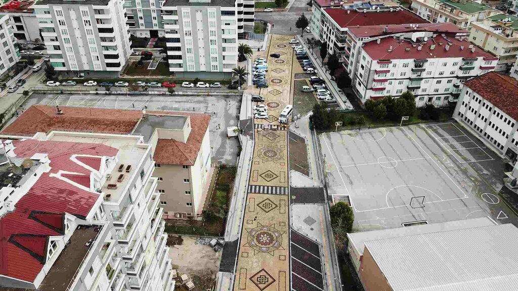 Atakum Belediyesi ekipleri, uzunluğu 300, genişliği ise 10 metre olan Doğuş Caddesi’nde gerçekleştirdiği özverili çalışmalarda 8 santimetre yüksekliğinde doğal rengine sahip begonit taşları kullandı. Samsun’da ilk defa kullanılan ve dört tarafı raylı kilit sistemine sahip taş döşemeyle birlikte kilit sistemi oluşturuyor. Caddenin her iki yanında bulunan okullar düşünüldüğünde uygulanan sistemde taşıt ve yayalar için emniyet faktörü ön planda olurken aynı zamanda yüzde 100 de konfor sağlıyor. Teknik özellikleriyle kullanım kolaylığı sağlanırken, arkeolojik kazılardan çıkan mozaik motiflerden esinlenerek tasarlanan kilim deseniyle de göz dolduruyor.
