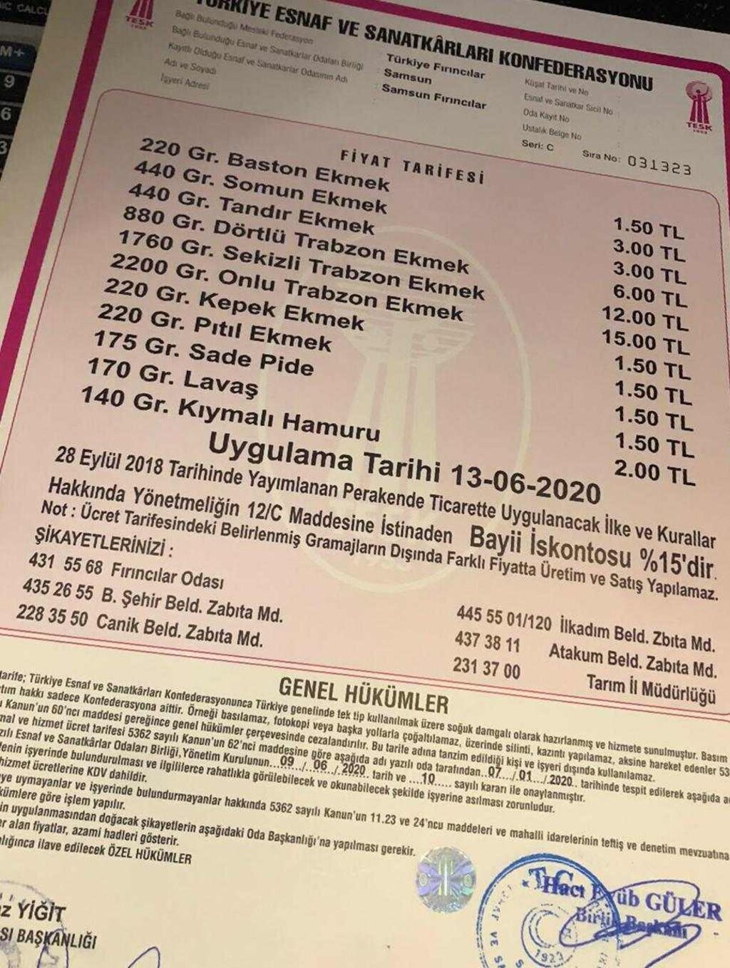 Samsun Fırıncılar Odası tarafından ekmek tarifesi ne zam yapıldı. Samsun ’da, 200 gramı 1 lira 25 kuruştan satışa sunulan ekmeğin yarından itibaren 220 gramının 1,50 TL’ye satışa sunulacağı açıklandı.