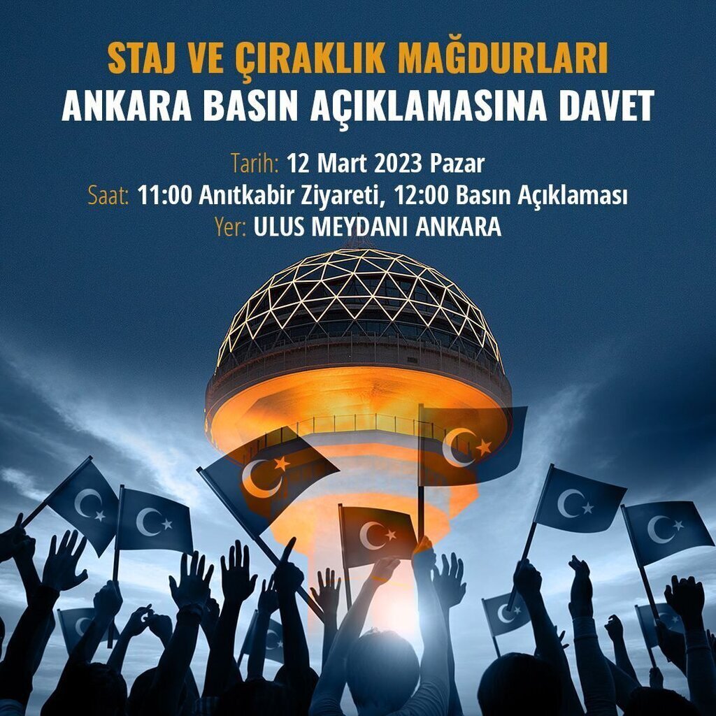 Staj ve çıraklık sigortası mağdurlarına uygulanan adaletsizliğin giderilmesi için 12 Mart 2023 Pazar günü saat 12.00’de Ulus Özgürlük Anıtı önünde binlerce kişi ile birlikte basın açıklaması yapılacak. Staj mağdurları etkinlikten önce saat 11.00’de Anıtkabir’i de ziyaret edecek.