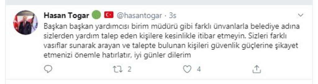 Tekkeköylü vatandaşları sahtekarlara karşı uyaran Başkan Togar, “Başkan, başkan yardımcısı, birim müdürü gibi farklı ünvanlarla, belediye adına sizlerden yardım talep eden kişilere kesinlikle itibar etmeyin. Sizleri farklı vasıflar sunarak arayan ve talepte bulunan kişileri emniyet ya da jandarmaya şikayet etmenizi rica ederiz” ifadelerini kullandı.