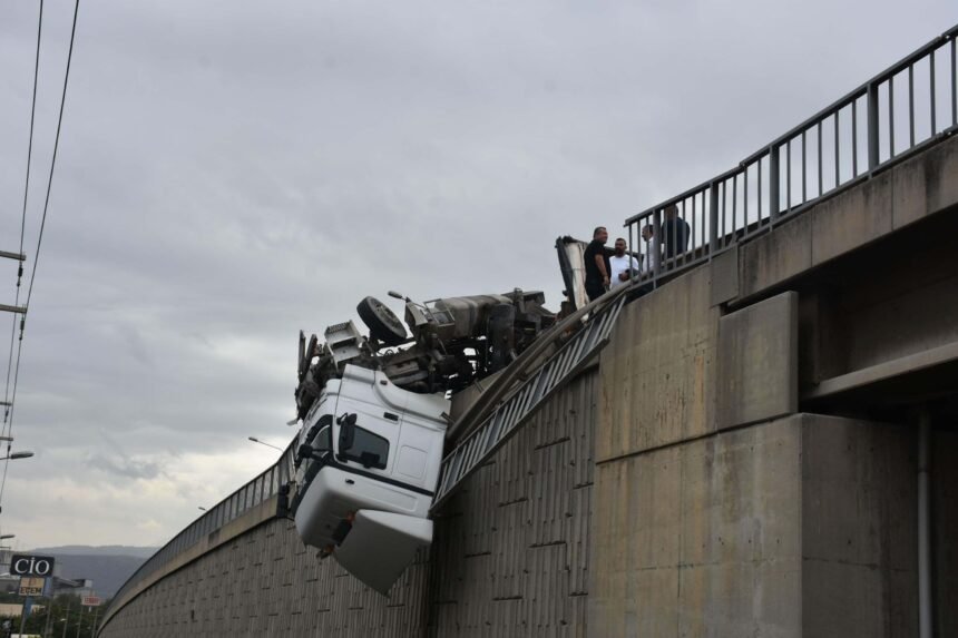 İZMİR’in Bornova ilçesinde TIR’ın devrilip, kupasının da viyadükte asılı kaldığı kazanın güvenlik kamerası görüntüleri ortaya çıktı.