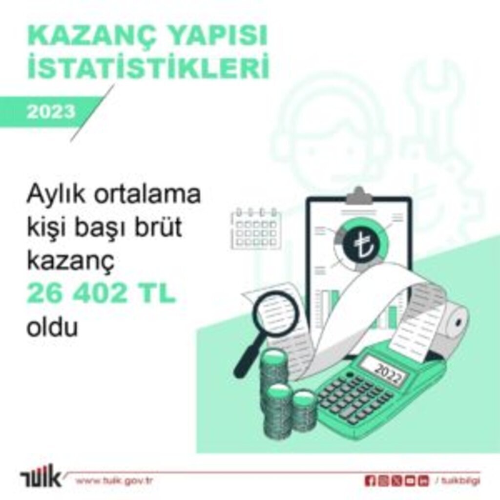 TÜRKİYE İstatistik Kurumu (TÜİK), 2023 yılında aylık ortalama kişi başı brüt kazancın 26 bin 402 TL olarak gerçekleştiğini açıkladı.